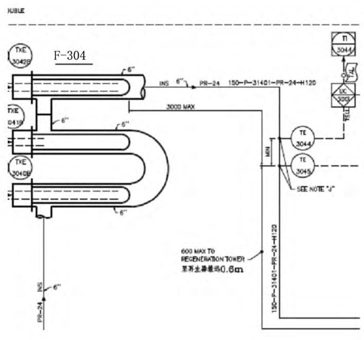 如图 1 所示为空气电加热器至再生器干燥区入口流程图,按照 UOP 要求,此段管线几何长度不得超过 3m,且热电偶TE3045 距再生器不得超过 0. 6m。按照上述要求,通常配管布置有如图 2 和图 3 两种布置方式。图 2 为电加热器靠近再生器且空气电加热器至再生器干燥区入口流程图,此时管线几何长度为 3. 6m;如图 3 所示,电加热器出口与干燥区入口正对且同标高,管线几何长度为 1. 0m。两种布置方式空气电加热器均在构架内。